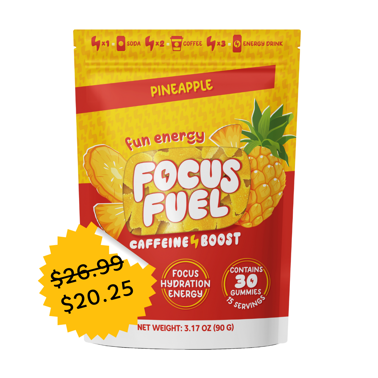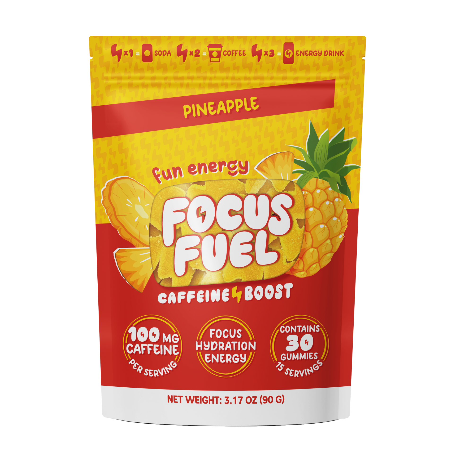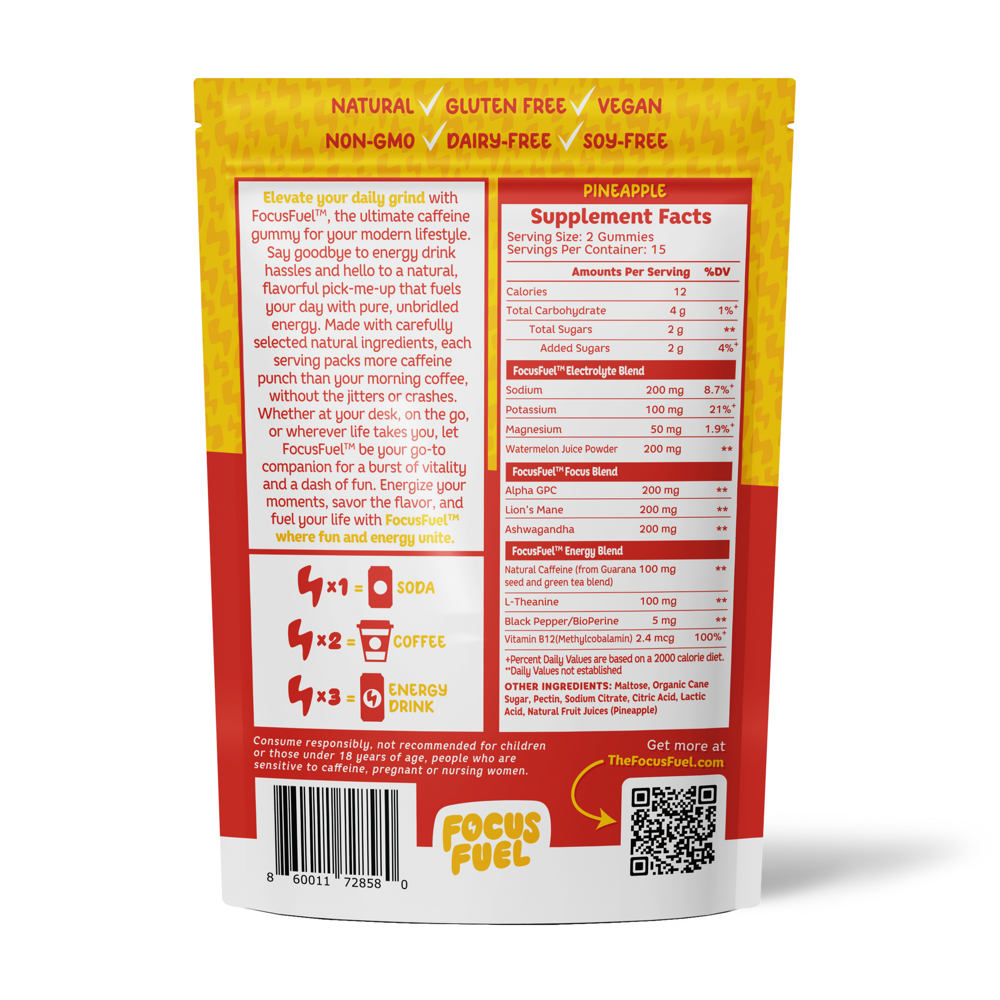 Each FocusFuel Gummy contains 50 milligrams of natural caffeine and each serving (2 Gummies) contains 100 milligrams of natural caffeine, offering a precisely measured dose to keep you alert without the need for coffee or energy drinks.